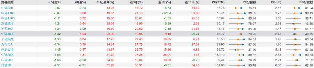 周四各大指数迎来普跌,百分位、估值出现一定程度下移,可以作为参考因子,当分位点达到高点,可以辅助短期操作进行高抛,当分位点调整至低点,可以辅助短期操作进行低吸。中期可以在低估点位,逐步开始定投。(蓝色当前,黄色是平均)。数据来源:Wind