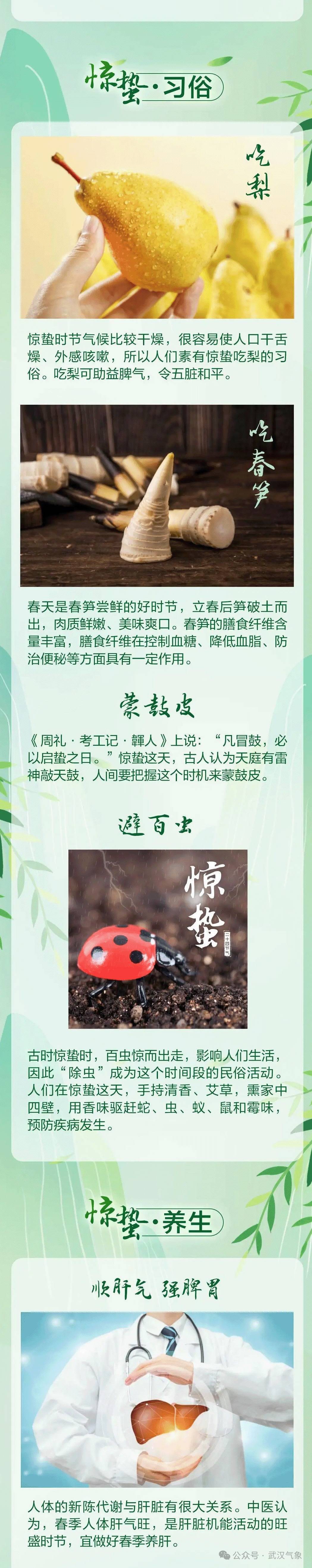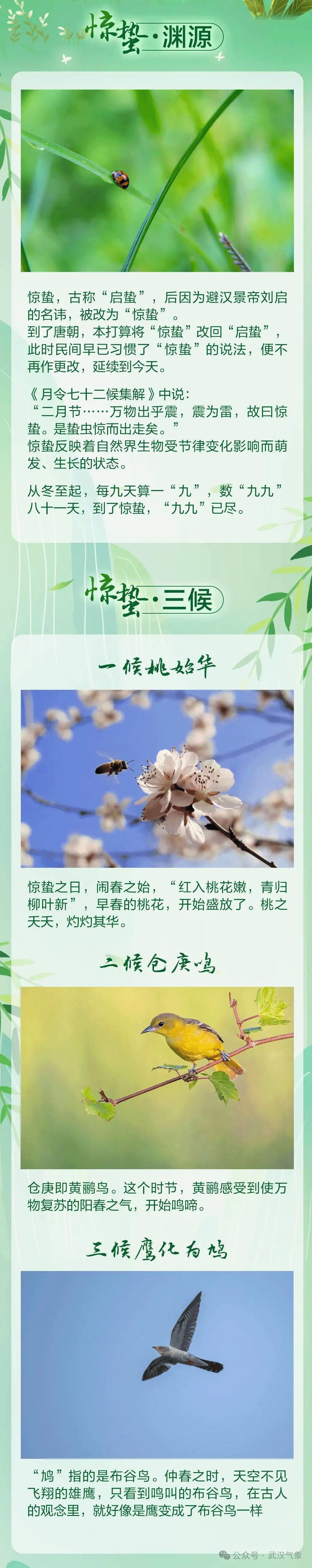 湖北日报讯(记者汤炜玮、通讯员高琪清)3月5日,迎来惊蛰节气。此时节气温回升、春雷乍动、雨水增多,生物受节律变化影响而苏醒、生机盎然,草木萌发、踏春赏花正当时,可以多到户外走走看看,感受万物复苏的浓浓春光。