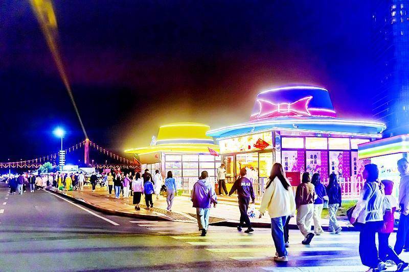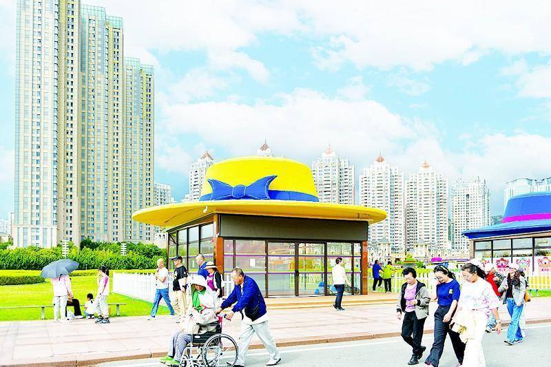 白天的广场,烟火人间与文创灵光交织—— 彩虹集市、海鸥集市和花木里·山海集三大集市的铺位都已经正常营业纳客,备好货品与食材的商铺里,工作人员都在紧张忙碌。 在彩虹集市中间,硕大的遮阳伞杆上插着五星红旗,供游客使用的桌子和长凳以及旁边的垃圾箱都是彩虹条纹,三三两两的游客坐在凳子上休息、吃饭,闲适而从容。 在海鸥集市的“文创奇遇”街区,几十家文创小摊吸引了很多游人。大连景观的“冰箱贴”、明信片、海洋玩偶、贝壳饰品、文创雪糕等别具特色。记者问一家摊主“哪个最能代表大连”,她推荐了一款有轨电车形状的长方形冰箱贴,电车上的小配饰还能左右滑动。另一家摊主介绍,她的商铺销售的大连景观冰箱贴多是她和朋友成立的工作室自行设计的,拥有独立的知识产权,而加工制作都是委托南方的厂家来做的。还有一些商铺经营的是来自外地的文创商品。陶瓷杯、珍珠工艺品、中药香薰制品……给星海广场增加了文化色彩。