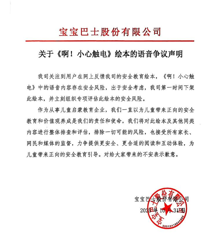 10月31日晚,宝宝巴士官微发布关于《啊!小心触电》绘本的语音争议声明 ,表示“出于安全考虑,我司第一时间下架此绘本,并立刻组织专项评估此绘本的安全风险。”